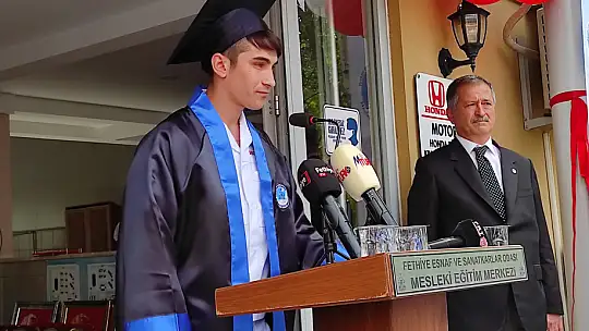 Muğla İl Eğitim Müdürü Emre Çay, “Motorlu teknoloji araçlar atölyemizin açılışı hem de 2021 yılında mezuniyet töreninde sizlerle olmaktan dolayı mutluyum. Bugün hem milli eğitim bakanlığımızın hem de aslında Cumhurbaşkanımızın en önemsediği konu için buradayız. Gerçekten meslek lisesi memleket meselesi parolasıyla çıkılan bu yolda geçtiğimiz o zor günlerde pandemi günlerinde de gördük ki meslek lisesi aynı zamanda kara gün dostu. Meslek lisesi öğrencilerimiz o zor günlerde kimi kimya bölümünde dezenfektan üretti, kimisi giyim atölyelerinde maske üretti, kimisi yangında sabah kahvaltısı ve akşam yemeğinde 5.000 kişi Kızılay ile iş birliği içerisinde yemek üretti. Meslek lisesi aslında ülkemizin beklide en can alıcı okul türü olarak görüyor ve bu ülkenin geleceği olarak biz onlara yatırım yaptığımızı düşünüyoruz. Mesleki eğitim merkezini ise meslek lisesinden ayıran en önemli farklardan biriside 11.sınıfta kalfalık. 12.sınıfta ustalık belgesi alabilirken diğer taraftan da son düzenlemeyle lise diplomasını da alabilmesi bu açıdan çok ehemmiyetli ve diğer liselerden kendisini ayıran bir özelliğe taşımıştır. Mesleki eğitim merkezlerimiz gençlerimizin yaratılışında var olan ilgi, istidat ve becerilerini ahilik anlayışıyla yoğurarak onların birer mutlu meslek edinmelerini sağlamak için kurduğumuz ve faaliyetlerini yürüttüğümüz merkezlerimizdir. Biz hem bakanlık olarak hem il milli eğitim müdürlüğü olarak memleket meselesi olarak görmeye devam ediyoruz ve meslek liselerimizin eğitimini önemsiyoruz bunu somut olarak da hem hayırseverlerimizin desteklerini arttırmaya devam edeceğiz. Düşüncelerimi gerçekleştirip yatırımlarımızı bu yönde yapmaya devam edeceğiz. Geçtiğimiz günlerde cumhurbaşkanlığımız külliyesinde sayın cumhurbaşkanımızın himayelerinde mesleki eğitimde 1.000 okul ve 50 arge merkezinin açılış programı yapıldı ve biz o programdayken şöyle bir müjde verildi. Daha önce stajyer iken asgari ücretin 3’te 1 oranında ücret alırken o oran %50’ye çekildi dolayısıyla askeri ücretin yarısı kadar hem okuyacaksınız hem ücret almaya devam edeceksiniz. Allah yolunuzu bahtınızı açık etsin inşallah sevdiğiniz ve mutlu olduğunuz meslekleri icra edersiniz ve en önemlisi de fakir ile zenginin işini aynı hassasiyetle yapan birer usta, birer esnaf olursunuz” diye konuştu.