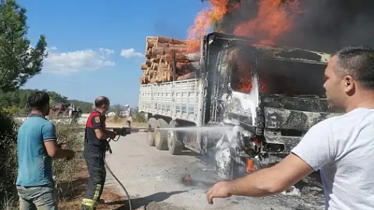Muğla'nın Kavaklıdere ilçesinde seyir halindeki tomruk yüklü kamyon alev aldı.