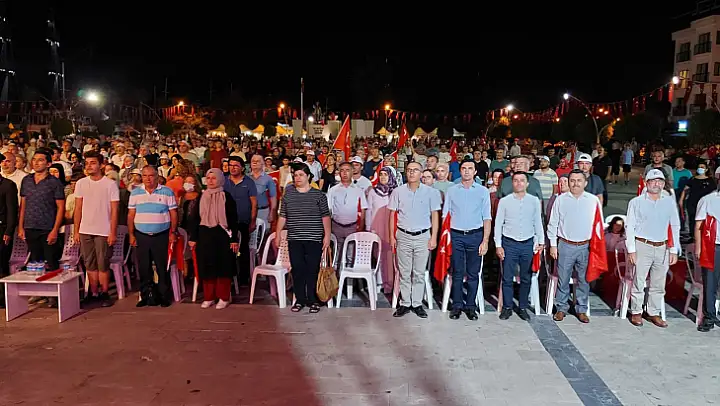 Etkinlikte Fethiye Kaymakamı Alper Balcı'da konuşma yaptı. Kaymakam Balcı konuşmasında “Sayın Cumhurbaşkanımızın çağrısıyla sokaklara dökülen Türk Halkı'na minnettarım. O gün halkımız olmasaydı bu fetöcü hain teröristler, eninde sonunda yenileceklerdi ama iş daha da uzayacaktı. Beni ilgilendiren kısmıyla konuşmama devam etmek istiyorum. 252 tane vatan evladı şehit oldu, onlara rahmet diliyorum. 2200 gazimiz oldu onlara minnet duygularımı arz ediyorum. Bir tanesi aramızda Kadir Osman Uzunbey, burada yanımda. Onlara minnettarız. Ben 1996 yılında Gazi Üniversitesi İktisat Bölümü'nü kazandım. Van'dan yeni gelmişim Ankara'yı hiç bilmiyorum. Amcamın oğlu, kuzenim Fatih Mehmet Bozkurt, Polis Akademisi'nden burslu olarak ODTÜ'de okuyor. Tuttu elimden götürdü, kayıt oluyoruz. Bir masa kurulmuş, masadakiler bizi illa bir yere çağırıyorlar. Ben acemiyim ama kuzenim inanılmaz tepki veriyor. O bunlara tepki verdikçe bunlar teşekkür ediyor. İçimden dedim ki bunlar nasıl insanlar. Bizi evlerine davet ediyorlar. ‘Kuzen bunlar kim' dedim. Dedi ki “Bunlar F tipi. Bunlardan uzak dur bunlar vatan haini'. Sene 1996. Ben büyüklerimin sözünü hep tuttum. Fakültede onlarla savaştık geldik Kaymakam olduk yine karşımıza çıktılar. Tunceli-Ağrı-Ardahan'da çalışan tek Mülkiye Amiriyim bununla da gurur duyuyorum. Bu hain örgüt özellikle Bakanlıkların, askeri yetkililerin personel kısımlarındaydılar. Onlar bizi sürüyorlardı biz de inadına onlara sövüyorduk. Sene 2010, Ağrı'da Ağrı Vali Yardımcısıyım. Habur Kaymakamlığına bakıyorum. Fatih Eryılmaz müdürüm ile beraberiz. O da fetö mağdurlarından. Ben ona fetö uzmanı diyordum. Onu gözaltına aldılar, tutukladılar geri döndü. Onlara inat hukuk fakültesini bitirdi mezun oldu. Onunla konuşuyoruz 2010 yılında Habur'dayız. Bir de bunların bir propagandası vardı. Bunlar kendilerini demokrasi pıtırcığı, hoşgörü elçisi ilan ederlerdi. Bunlar kendilerini zararsız, kimseye zararları olmayacakmış gibi lanse ederlerdi. Fatih Eryılmaz müdürüm o günlerde söylüyordu ‘Bir gün bunlar kalkışma yapacak biz bunlarla savaşacağız' diyordu. Sene 2016 15 Temmuz günü kendisi Ankara Emniyet Müdürlüğü önünde bu namussuz vatan hainleri ile savaşırken yaralandı, karnından mermi yedi. Hastanede muhabir kendisine soruyor, ‘Nasılsınız' diyor. ‘Çok mutluyum' diye yanıtlıyor gülerek. Düşünün mermi yemiş bir vatan evladı. Mutluyum der mi? Diyor. Mutluluğunun sebebi şu ‘Ben bunlarla 25 sene mücadele ettim bugün en mutlu günüm. Ben bunlarla savaştım bugün benden daha mutlu kimse olamaz. Allah bunu bana nasip etti' diyor. Fatih Eryılmaz müdürüme selam olsun. Geçenlerde şehidimiz Yasin Naci Ağaroğlu'nun babasıyla konuştum, Osman Amcayla. Osman Amca, Osman Ağaroğlu Korkuteli'nden. Bana oğlunun nasıl şehit olduğunu anlattı gözyaşlarımı tutamadım. Ankara Hukuk son sınıf öğrencisi Yasin Naci Ağaroğlu. Babasıyla direkt telefon ile görüşüyorlar yarım saatte bir. Külliye'nin önünde nöbet tutuyor arkadaşlarıyla beraber. Her yarım saatte bir babasına rapor veriyor. Saat 4'e doğru baba kalbi diyor ki ‘ Yasin Naci, oğlum tamam görevini yaptın artık eve dön' diyor, Ankara'daki öğrenci evine. Babasına yalan söylüyor vatan sevgisi, bayrak sevgisi yüzünden. ‘Tamam, babacım artık dönüyorum' diyor ama dönmüyor. Telefonu kapattıktan sonra devam ediyor ve hain fetöcü pilotların sıktığı kurşun ile Külliye'nin önünde şehit oluyor. Bu vatan sevgisini hiçbir yerde anlatamazsınız. Bu kavram olarak sadece Türk Milleti'nde var. Şehidimize Allah rahmet eylesin. Benim burada konuşmaya bir de şöyle hakkım var. Bu hain fetöcü hareket özellikle Polis Özel Harekâtı vurdu o gün. Niye Polis Özel Harekâtı vurdu Gölbaşı'ndaki çünkü biliyorlardı ki Polis Özel Harekat ocaktır. Onlar son mermilerine kadar savaşırlar, kendilerine karşı koyarlar. Ankara Emniyet Müdürü'müzün çağrısıyla herkes Özel Harekât Daire Başkanlığı'nda buluşuyor, fetöcü hainlere karşı koymak için. Bunlar benim arkadaşlarım. Çukur-Barikat operasyonlarında pkk ile çatışan kahramanlar. Ve buluştukları an ‘A9 hedef tamamen PÖH' diye anons ediyor fetöcü hain pilot. Benim babamın kendi elleriyle kurduğu, yedinci döneme dek hocalık yaptığı Özel Harekât Daire Başkanlığı'nı kendi uçağımızla, bombamızla vuruyor. 51 tane arkadaşım şehit oldu. 11'i kadın özel harekâtçı. Rizeli Fikret Metin Öztürk. Şırnak'tayız şehri çevirmişiz teröristlerin hiçbir kaçma imkânı yok. Ben biraz dinlen diyorum. Onun bana verdiği cevap ‘ Sayın Valim, launcher mühimmatımız bitti. Senin Ankara ile aran iyidir bana launcher mühimmatı bul' diyor. Ben dinlen dedikçe o savaşalım, işi bitirelim diyor. Böyle bir kahramandır Rize Kalkandere'li Fikret Metin Öztürk. Yandı kül oldu o gün bombamızla. Iğdırlı Bülent Yurtseven Baş Komiserim, Cizre'de, 1.95 boyunda, böyle bir kahraman yok. Onun neler yaptığını ben biliyorum. Cizre'deki kahramanlıkları, girilmez denilen yere girmesini. Cenazesini zor tanıdık bomba öyle yakmış, Allah rahmet eylesin. Düzceli Çerkes delikanlısı Ufuk Baysan müdürümle bir ay boyunca İdil'de beraberdik. Silopi ile başladık Cizre'yi aldık oradan İdil'e geçtik sonra Şırnak'a geçtik. 30 gün boyunca kuru ekmek yedi. Biraz malzeme bulduğumuzda Polis noktalarında tost yapabiliyorduk. Ben böyle mütevazı bir adam görmedim. Ufuk Baysan müdürümü Özel Harekât Daire Başkanlığı'nda şehit ettiler. Kolay yetişmiyor bu özel harekâtçılar. Devlet milyonlarını harcıyor bu vatan evlatlarına, kahramanlarına. Şehit oldu benim Ufuk Müdürüm. Meriç Alemdar Müdürüm Trabzonlu. Çok soğukkanlı vücut geliştirme yapar, ikide bir bana takılır. 