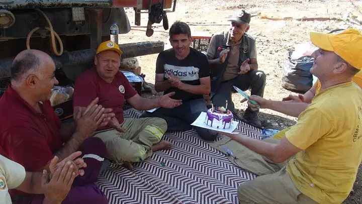 Menteşe Orman İşletme Müdürlüğünde görevli Erdem Güneş, yeni yaşını ormanda soğutma çalışması yaparken kutladı. Mesai arkadaşları tarafından sürpriz doğum günü kutlaması düzenlenen Erdem Güneş'i pastadan ilk lokmayı ise alevlere karşı omuz omuza mücadele verdiği oğlu Mehmet Güneş yedirdi. Erdem Güneş, “Muğla Orman Bölge Müdürlüğü A-90 TOKİ ekibi olarak arkadaşlarla birlikte çalışıyoruz. Takriben 13-14 günden beri yangınlarla yeşil vatanımız için savaşıyoruz. Soğutma çalışmaları devam ediyor. Arkadaşlar da bu yorgunluğun üzerine moral motivasyon olsun diye yaş günü sürprizi düzenlemişler. Teşekkür ediyorum hepsine. Oğlum da kendi yolumda takriben 12 senedir yaptığım işi yapıyor. Yeni askerden geldi. Onu da eğitmeye çalışıyoruz yeşil vatanımız için. Yeşilimizi koruyalım” dedi.