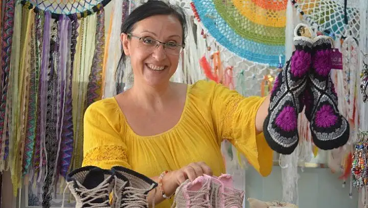 Kışın özellikle ev ayakkabısı olarak görmeye alışkın olduğumuz örgü ayakkabıların yazlık modellerini üreten Işık, 'Bu ayakkabıları özel pamuk iplerden yapıyorum. Tabanlarını hazır alıyorum onun dışında müşterinin istediği özel modeli 1 ya da 2 gün içinde bitiriyorum. Ama ellerim delik deşik oluyor, iğne batıyor tığ batıyor ama neticeyi görünce tüm acılarım geçiyor. Bu ayakkabılar hava aldığı için ayağı terletmiyor dolayısı ile hava alan ve terlemeyen ayaklarda mantar riski azalıyor' ifadelerini kullandı.