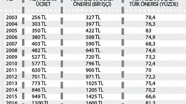 Asgari ücret, halen bekar bir işçi için aylık brüt 2 bin 943 lira, vergiler ve kesintiler düştüğünde net 2 bin 324 lira 71 kuruş olarak uygulanıyor. Apartman görevlileri için ise normal işçilerden farklı olarak gelir ve damga vergileri kesilmediği için net 2 bin 501 lira 55 kuruş olarak hesaplanıyor. Asgari ücretin işverene toplam maliyeti, bir işçi için 3 bin 458 lira. Bunun 2 bin 943 lirasını brüt asgari ücret, 456 lira 17 kuruşunu sosyal güvenlik primi, 58 lira 86 kuruşunu işveren işsizlik sigorta fonu oluşturuyor.Yıllar bazında net asgari ücret rakamları ise şöyle:
