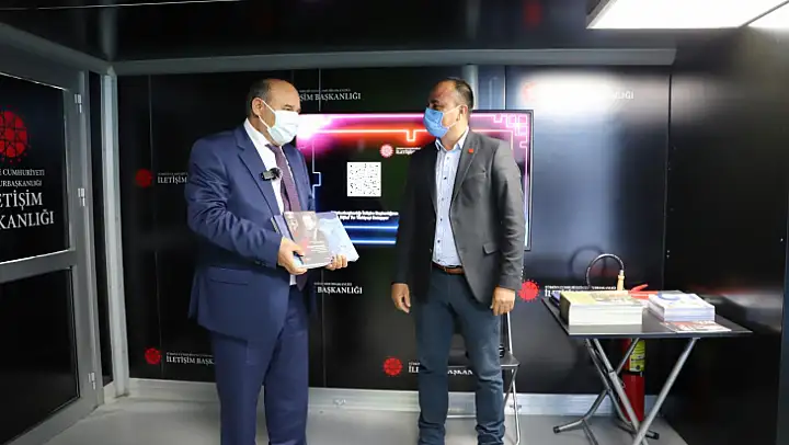 Dijital Tır'ı ziyaret eden Başkan Otgöz'e teşekkür eden İletişim Başkanlığı Bölge Müdürlüğü Halkla İlişkiler Birim Amiri Erdal Şener, Başkan Otgöz'e İletişim Başkanlığı'nın kitaplarını takdim etti.
