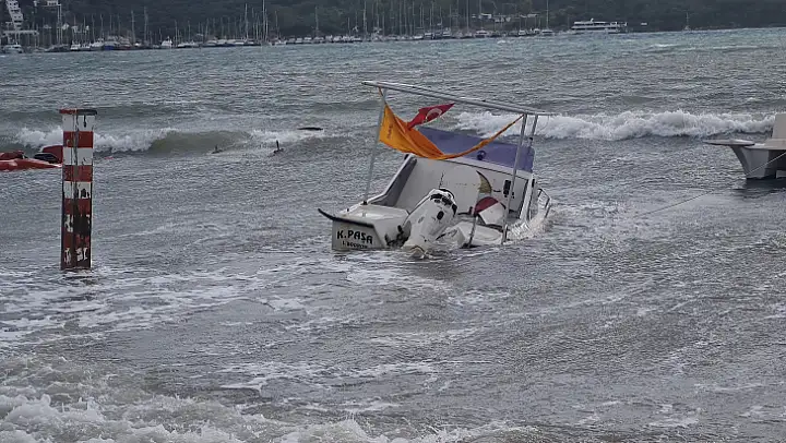 Muğla'nın Bodrum ilçesinde etkili olan fırtına nedeniyle tekneler battı, ağaçlar devrildi, işletmelerin tenteleri zarar gördü.