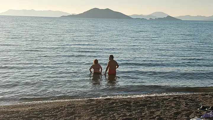 Hava sıcaklıkları düşmeye başlamasına rağmen Fethiye'de güneşli günler yüz güldürüyor. Çalış Plajı'nda yerli ve yabancı bazı tatilciler hâlâ denize girip güneşlenmeye devam ediyor.