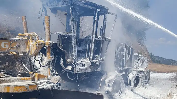 Muğla'nın Köyceğiz ilçesine bağlı Çövenni yaylasında ormanlık alanda yol açma çalışması yapan iş makinesi, henüz bilinmeyen bir nedenle alev aldı.