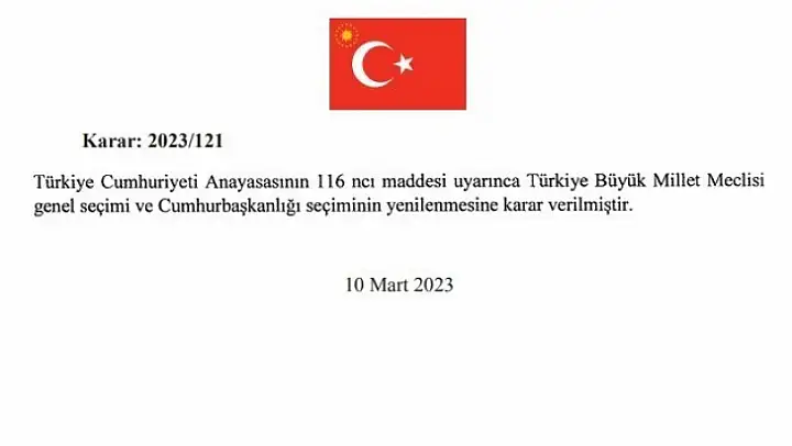 Resmi Gazete'de 2023/121 sayılı Cumhurbaşkanı Kararı ile Türkiye Cumhuriyeti Anayasası'nın 116. maddesi uyarınca Türkiye Büyük Millet Meclisi (TBMM) genel seçimi ve Cumhurbaşkanlığı seçiminin yenilenmesine karar verildiği yayımlandı.