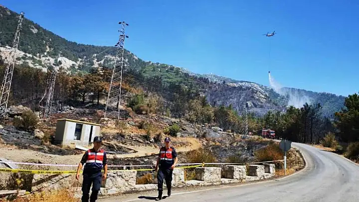 Muğla'nın Datça ilçesine bağlı Mesudiye Mahallesi'nde 13 Temmuz'da 300 hektarı ormanlık, 400 hektarı da tarım arazisi olan toplam 700 hektar alanın zarar gördüğü yangının çıkış noktası olarak değerlendirilen trafo çevresinde jandarma ekipleri inceleme yaptı.