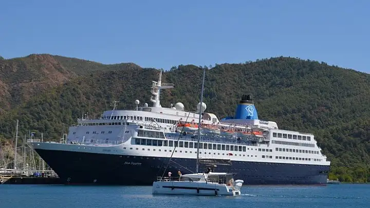 200 metre uzunluğunda, 29 metre genişliğindeki Bahama bayraklı 'Blue Sapphire' adlı transatlantik lüks gemi, 218 yolcusuyla Muğla'nın Marmaris ilçesine demir attı.
