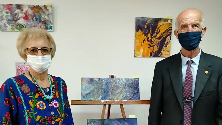 Nasuf Dinçer'in eşi, Fetav Müdürü Dilek Dinçer ise “ En az eşim kadar heyecanlıyım. Eşimin küçüklükten beri resime ilgisi varmış. Sürekli bir şeyler yapıyordu. Daha sonra Rahmetli Şükran teyzenin Çatı Ressamları grubu vardı. O grupla beraber soğuk seramik çalışmıştı. Çok güzel eserleri var, evimizde gururla sergiliyoruz. Bu pandemi döneminde yine resimle uğraşmak istedi ve araştırırken akrilik boya ile yapılan resimler ilgisini çekti. Bütün bir pandemi dönemini bu resimlerle geçirdik. Çok keyifli bir çalışma. Sürpriz çıkıyor, yani kat kat boyalar atıyorsunuz, oynuyorsunuz ardından ne çıkacağını bilemiyorsunuz. Mesela kat kat boyalar atıldıktan sonra küçük balonları bastırarak şekil verilen resimler var. İnanılmaz bir çiçek bahçesi çıkıyor. Kiminden deniz, kiminden gökyüzü, kiminden orman çıkıyor. Çok keyifli bir çalışma. Ben, eşim çalışmaları yaparken bazen fikirlerimle ona destek vermeye çalıştım. Bunu öğrencilere burs vermek için, sosyal bir proje için düzenledik. Çok da güzel talep var, arkadaşlarımız destek veriyorlar. Çok mutluyuz” şeklinde konuştu.