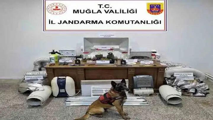 Bodrum İlçe Jandarma ekipleri yapılan istihbarı çalışmalar sonucu, Gümüşlük Mahallesi'nde ikamet eden O.F.B. isimli şahsın ikametinde uyuşturucu madde bulundurduğu bilgisinin alınması üzerine şahsın evine operasyon düzenledi. Operasyona KOM ve Bodrum İlçe Jandarma ekipleri baskın yaptı. Eve giren ekipler evini uyuşturucu serasına çeviren O.F.B.'yi gözaltına aldı. Evde yapılan aramada; çok miktarda skunk, 10 kök kenevir, 1 adet hassas terazi, 10 adet extacy hap, 7 adet yurtdışı menşeili özel üretim skunk tohumu, 15 gr kenevir tohumu, 1 adet esrar öğütme aparatı, 79 parçadan oluşan kenevir üretmek için kullanılan iklimlendirme ve ışık sistemi, 950 ml sıvı gübre, 2 lt PH sıvı, 1 adet ruhsatsız tabanca ve fişekler, 1 adet pala ele geçirildi.