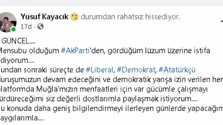 “Mensubu olduğum #AkParti'den, gördüğüm lüzum üzerine istifa ediyorum. Bundan sonraki süreçte de #Liberal, #Demokrat, #Atatürkçü duruşumuzun devam edeceğini ve demokratik yarışa izin verilen her platformda Muğla'mızın menfaatleri için var gücümle çalışmayı sürdüreceğimi siz değerli dostlarımla paylaşmak istiyorum. Bu konuda daha geniş bilgilendirmeyi ilerleyen günlerde yapacağım. Saygılarımla.” (FERDİ YAVUZ)