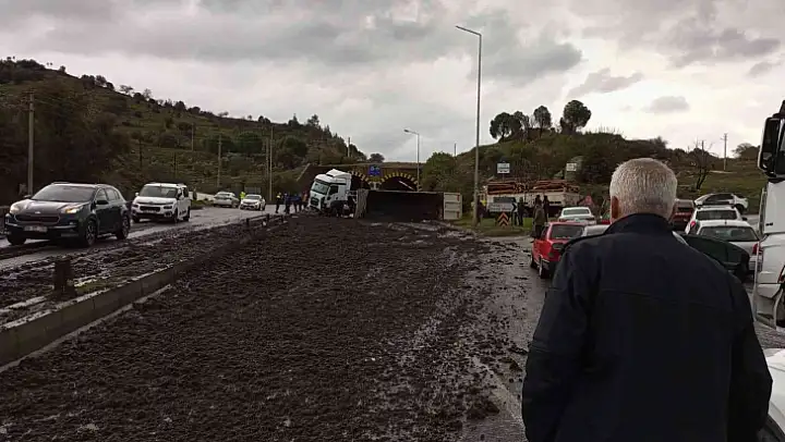 GÜBRE YÜKLÜ KAMYON DEVRİLDİ, KARAYOLUNDA 10 KİLOMETRE ARAÇ KUYRUĞU OLUŞTU