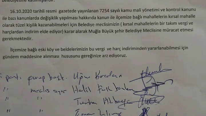 İyi Parti Seydikemer Belediye Meclisi Grup Başkanı Uğur Karadon ve partili meclis üyeleri tarafından sunulan önergede, “Seydikemer'e bağlı bazı mahallelerin kırsal mahalle olarak tüzel kişilik kazanabilmeleri için (kırsal mahallelerin bir takım vergi ve harçlardan indirim elde ediliyor) karar alarak; Muğla Büyükşehir Belediye Meclisi'ne müracaat etmesi gerekmektedir” ifadelerine yer verildi.