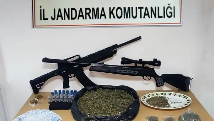 Şahsın ikametinde arama yapılan aramada, 1550 gr. kubar esrar, uyuşturucu öğütme ve kullanma aparatı, hassas terazi, tabanca, 45 adet 7,65 mm. tabanca mermisi, yarı otomatik seri numarası silinmiş av tüfeği, 2 adet tüfek şarjörü, 12 cal tüfeğe ait 25 adet fişek, havalı taktikal dürbünlü tüfek, zıpkın, 8bin 200 TL nakit para ele geçirildi.