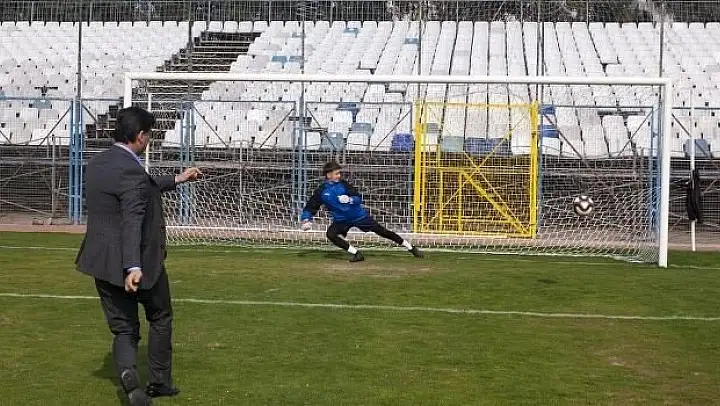 Eski futbolcu olması nedeniyle “Başkanım eski futbolcusunuz bir penaltı atar mısınız?” önerisini de kırmayan Alim Karaca, profesyonel futbolculara parmak ısırtan vuruşla Fethiyespor kalecisi Übeyt'i ters köşeye yatırarak gölünü attı.