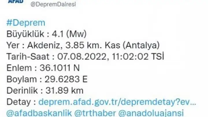 Antalya'nın Kaş ilçesi açıklarında saat 11.02'de 4.1 büyüklüğünde bir deprem meydana geldi. Sarsıntı çevre illerden de hissedilirken can ve mal kaybına ilişkin henüz bir açıklama yapılmadı.