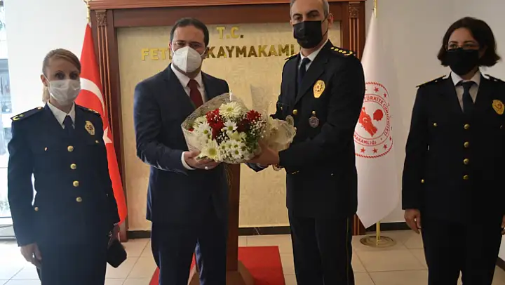 Türk Polis Teşkilatı'nın 176. Yılı etkinlikleri, Covid 19 tedbirleri kapsamında yapılıyor. Fethiye Kaymakamı Eyüp Fırat, ilçede başarılı şekilde görev yapan 30 polise başarı belgesi takdim etti. Fethiye İlçe Emniyet Müdürü İsmail Ayhan da Kaymakam Eyüp Fırat'a çiçek sunarak teşkilatın çalışmalarında gösterdiği desteklerinden dolayı teşekkür etti.