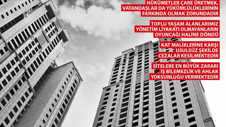 Binlerce kat malikinin ailesiyle beraber yaşadığı toplu konutlarda bazen çeteler, bazen ise organize olmuş kişiler ve gruplar ile karşı karşıya gelindiğini belirten Yıldırım, “İşini yönetemeyen ve yönetim liyakati olmayanların oyuncağı haline dönen site yönetimlerinin bütçeleri ve milyonlarca kişinin emeği ziyan ediliyor. Usulsüz yönetim tarzı, kat mülkiyeti kanununa uygun olmayan yapılar, gelirlerin usulsüz talep edilmesi ve giderlerin de gelişi güzel firmalara peşkeş çekilmesi sonucunda sitelerin bütçeleri sıkıntılı bir hale gelmektedir. Şeffaf yönetim anlayışı yerine kat maliklerini borçlandırmaktan başka bir vizyonları olmayan yöneticiler ise usulsüz davranışları karşısında tepki veren kat maliklerini hedef konumuna koymaktadır. Site yönetimleri belirli bir kaliteye ulaşamadığı ve kanunlarla da tam olarak korunamadığı için site yönetimine seçilen kişilerin kaderine terk edilmektedir” dedi.