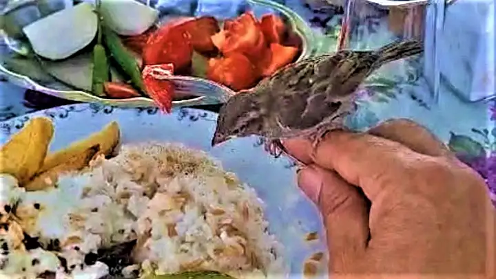Muğla'nın Seydikemer ilçesinde serçe yavrusunun tabağından pilav yediği kişinin omzunda da beslendiği anlar görüntülere yansıdı. Adeta insanın içini ısıtan görüntülerde Ferhat Akkoyun isimli şahıs, masasına davetsiz misafir serçe ile yemeğini ve suyunu paylaştı.