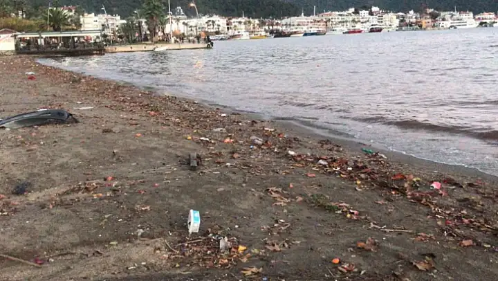 Türkiye'nin önemli turizm merkezlerinden Marmaris'in özellikle yaz aylarında tıklım tıklım dolan halk plajı sahilinde, sabah saatlerinde etkili olan yağmur, denizden ve derelerden kıyılara taşan atıkları ortaya çıkardı.