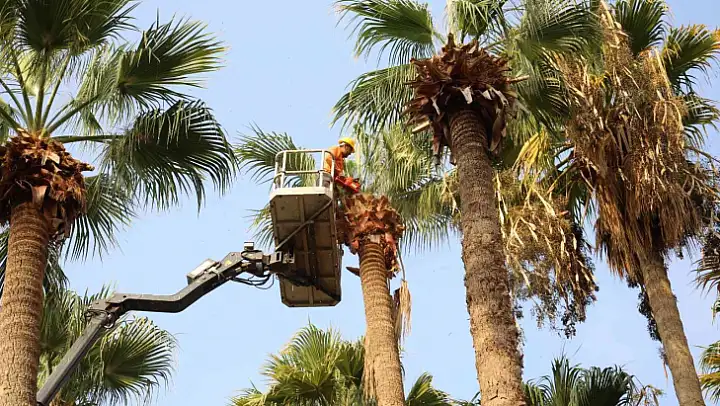 Atatürk Caddesi üzerinde yer alan palmiye budamalarının tamamlanmasının ardından ekipler Hasan Işık Caddesi'ne geçecek.