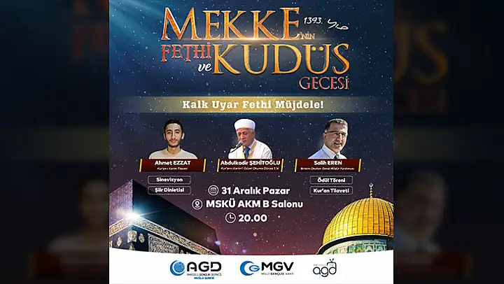 ''Mekke'nin Fethi ve Kudüs Gecesi'' programı, 31 Aralık Pazar günü saat 20.00'de Muğla Sıtkı Koçman Üniversitesi AKM B Salonu'nda gerçekleşecek.
