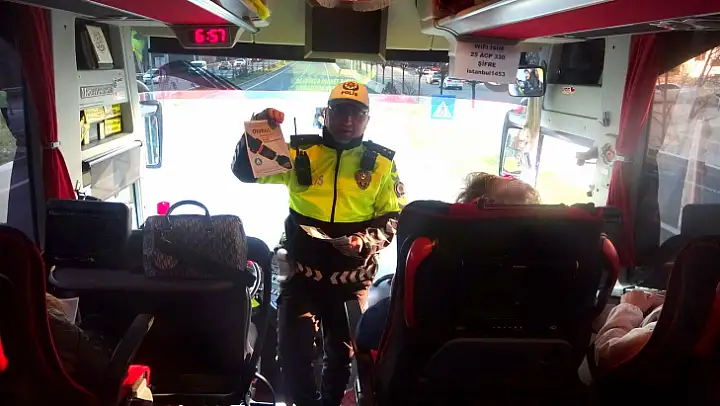 Muğla Trafik Tescil ve Denetleme Şube Müdürlüğü ekipleri tarafından otobüslerde kemer denetimi ve uyarı broşürü dağıtıldı.