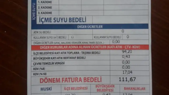 MUSKİ tarafından işletmeye sayaç okunmadan gönderilen faturaya, atık su, kullanım suyu ve çevre temizlik vergisi bedelleri yansıtılmazken, ilçe belediyesi katı atık toplama, taşıma bedeli olarak 94,20 lira, büyükşehir katı atık bertaraf bedeli olarak 43 kuruş ve KDV olarak 17,04 lira yansıtıldı.