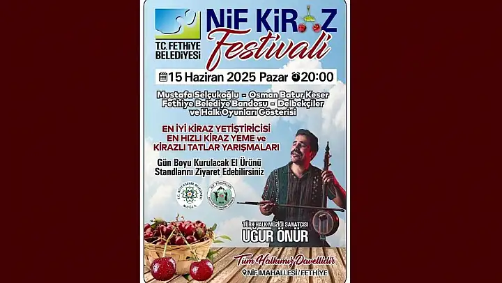 Fethiye Belediyesi tarafından düzenlenen Nif Kiraz Festivali, 15 Haziran Pazar günü saat 20.00'de Nif Mahallesi'nde gerçekleştirilecek. Festivalde konserler, halk oyunları ve çeşitli yarışmalarla ziyaretçilere unutulmaz bir gün yaşatılacak.