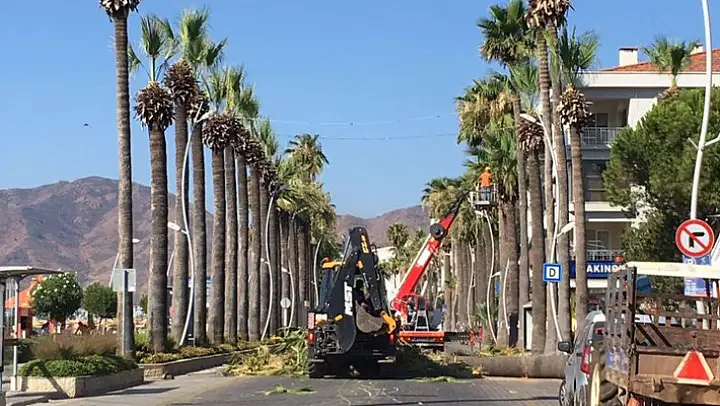 Marmaris Belediyesi Park ve Bahçeler Müdürlüğü ekipleri Marmaris'in simgesi palmiye ağaçlarının mevsimsel budamasına devam ediyor. 3 gün boyunca 02.00-10.00 saatleri arasında Atatürk ve Hasan Işık caddelerinde yapılacak çalışma, program dâhilinde tüm bölgelerde devam edeceğini öğrenildi.