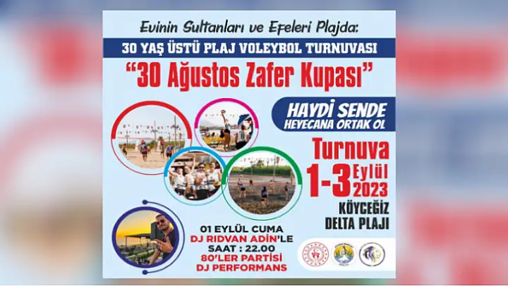 30 Ağustos Zafer Kupası Plaj Voleybol Turnuvası Köyceğiz Gençlik ve Spor İlçe Müdürlüğü, Köyceğiz Belediyesi ve Köyceğiz Akademi Spor Kulübü tarafından organize edildi. ‘'Evinin Sultanları'' projesi çerçevesinde ‘' düzenlenen 30 Ağustos Zafer Kupası Plaj Voleybol Turnuvası 1-3 Eylül tarihlerinde Köyceğiz Delta plajında yapılacak.
