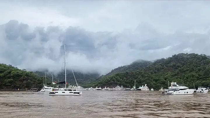Muğla'nın Fethiye ilçesinde Salı gününden itibaren etkili olan gök gürültülü sağanak yağış sonrası Göcek'te denizin rengi değişti.