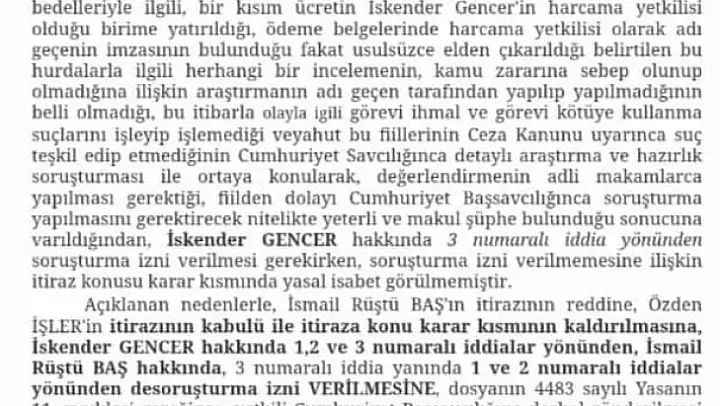 Aynı zamanda Bölge İdare Mahkemesi kararında eski hastanedeki malzemelerin hurdaya çıkarılarak usulsüz şekilde satışı ile ilgili olarak Cumhuriyet Başsavcılığınca soruşturma açılması gerektirecek nitelikte yeterli ve makul şüphenin bulunduğunu belirterek Destek Hizmetleri Başkan Yardımcısı İsmail Rüştü Baş tarafından, hakkında soruşturma izni verilmesine ilişkin karara karşı yapılan itirazın reddinin gerektiğini belirtti. (FERDİ YAVUZ)