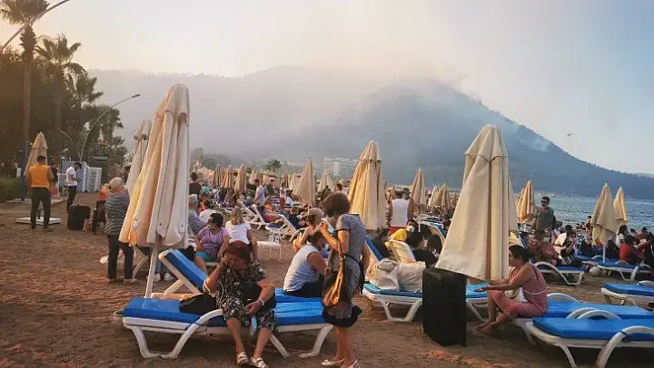 Muğla'nın Marmaris ilçesinde çıkan orman yangını nedeniyle boşaltılan otellerdeki yerli ve yabancı turistler sahil bölgesine getirildi.