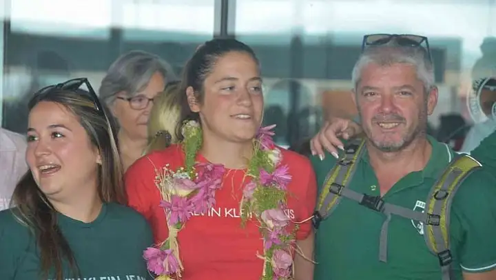 Aysu Türkoğlu, babası Mustafa Türkoğlu ile İngiltere'den memleketi Bodrum'a döndü. Genç yüzücü, Milas - Bodrum Havalimanı'nda davullu zurnalı törenle karşılandı. Törene, Aysu'nun ailesi, yakınları ve arkadaşlarının yanı sıra Bodrum Belediyesi Başkan Yardımcısı Ummahan Yurt, Bodrumspor Yüzme Takımı katıldı.