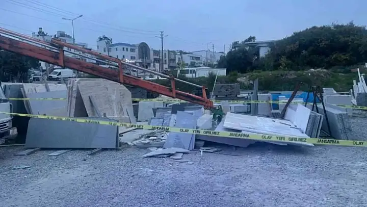 Edinilen bilgiye göre, olay, Akçaalan Mahallesi'nde bir mermer satış ofisi önünde meydana geldi. Mermerleri taşımak için vinç ile gelen 44 yaşındaki Mehmet Küçükbaş, bir süre kapı önünde arkadaşlarıyla sohbet etti. O esnada tonlarca mermer tableti, Küçükbaş'ın üzerine devrildi. Bunun üzerine hızlı bir şekilde arkadaşlarının ve vinç yardımıyla mermerlerin altından çıkarılan Küçükbaş, ambulansla Bodrum'daki özel bir hastaneye kaldırıldı. Jandarma ekipleri olay yerine gelerek incelemelerde bulundu.