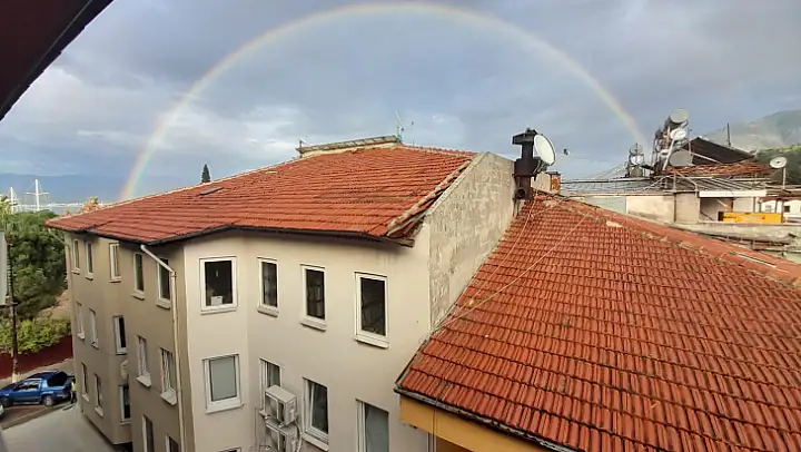 Fethiye'de uzun aradan sonra yağış yüzünü gösterdi. 7 Kasım Pazartesi günü saat 16.30 sularında başlayan hafif yağış sonrası çıkan gökkuşağı, adeta bir görsel şölen yaşattı.