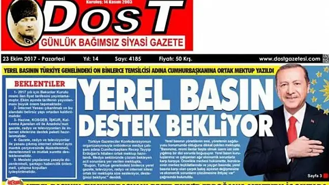 Yerel basının sorunları ve çözüm önerileri, dün bütün Türkiye’de, Türkiye Gazeteciler Konfederasyonunun organizasyonuyla yerel medya kurumları tarafından gündeme getirildi. Türkiye Gazeteciler Konfederasyonu tarafından yerel basının sorunlarının çözümü amacıyla Cumhurbaşkanı Recep Tayyip Erdoğan'a hitaben yazılan mektup, bini aşkın yerel gazete, radyo, televizyon ve internet sitesinde haber oldu.