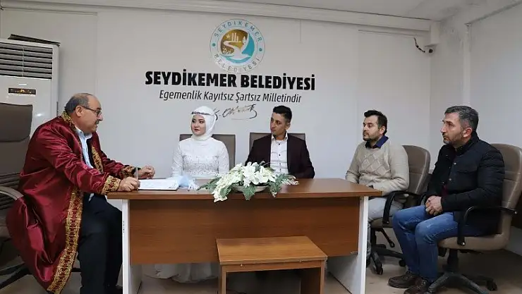 Seydikemer Belediye Başkanı Yakup Otgöz, belediye personeli Mehmet Cesur ve Büşra Kocakaya, belediye personeli Mustafa Kaplan ve Kezban Çatal, belediye personeli Bekir Kocakaya'nın kızı Hasret Kocakaya ve Adem Karcı çiftlerinin nikah akitlerini 14 şubat sevgililer günü vesilesiyle gerçekleştirdi.