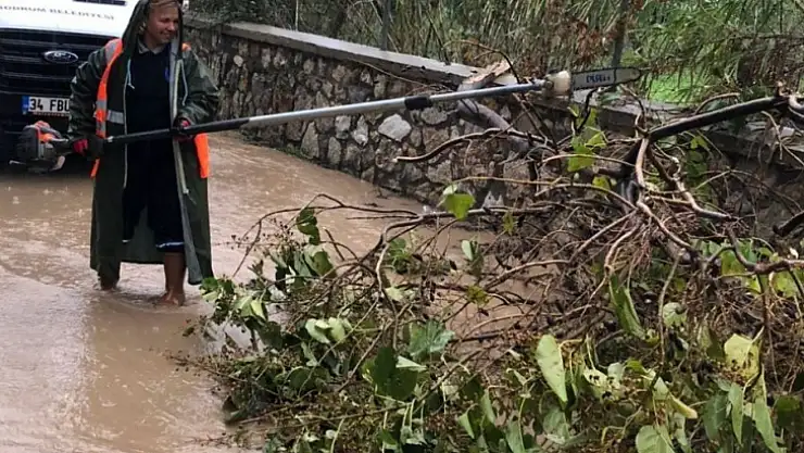 Metrekareye 7 saatte 43 kilogram yağışın düştüğü Muğla'nın Bodrum ilçesinde Bodrum Belediyesi ekipleri saha çalışmaları gerçekleştiriyor.