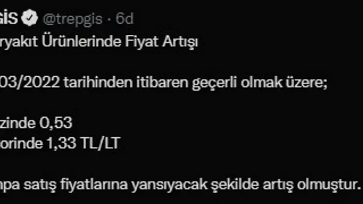 Enerji Petrol Gaz İkmal İstasyonları İşveren Sendikasından (EPGİS) alınan bilgiye göre, Fethiye’de ortalama 17,71 liradan satılan benzinin litre fiyatı 18,24 lira olacak. Ayrıca, ortalama 17,88 liradan satılan motorinin litre fiyatı 19,21 lira olacak.