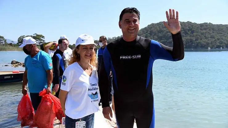 Dalgıç elbisesi giyen sertifika sahibi Fethiye Belediye Başkanı Alim Karaca, Dünya Çevre Haftası etkinlikleri kapsamında düzenlenen etkinlikte Ölüdeniz Lagünü'nde dalış yaparak, deniz dibi temizliğine katıldı.
