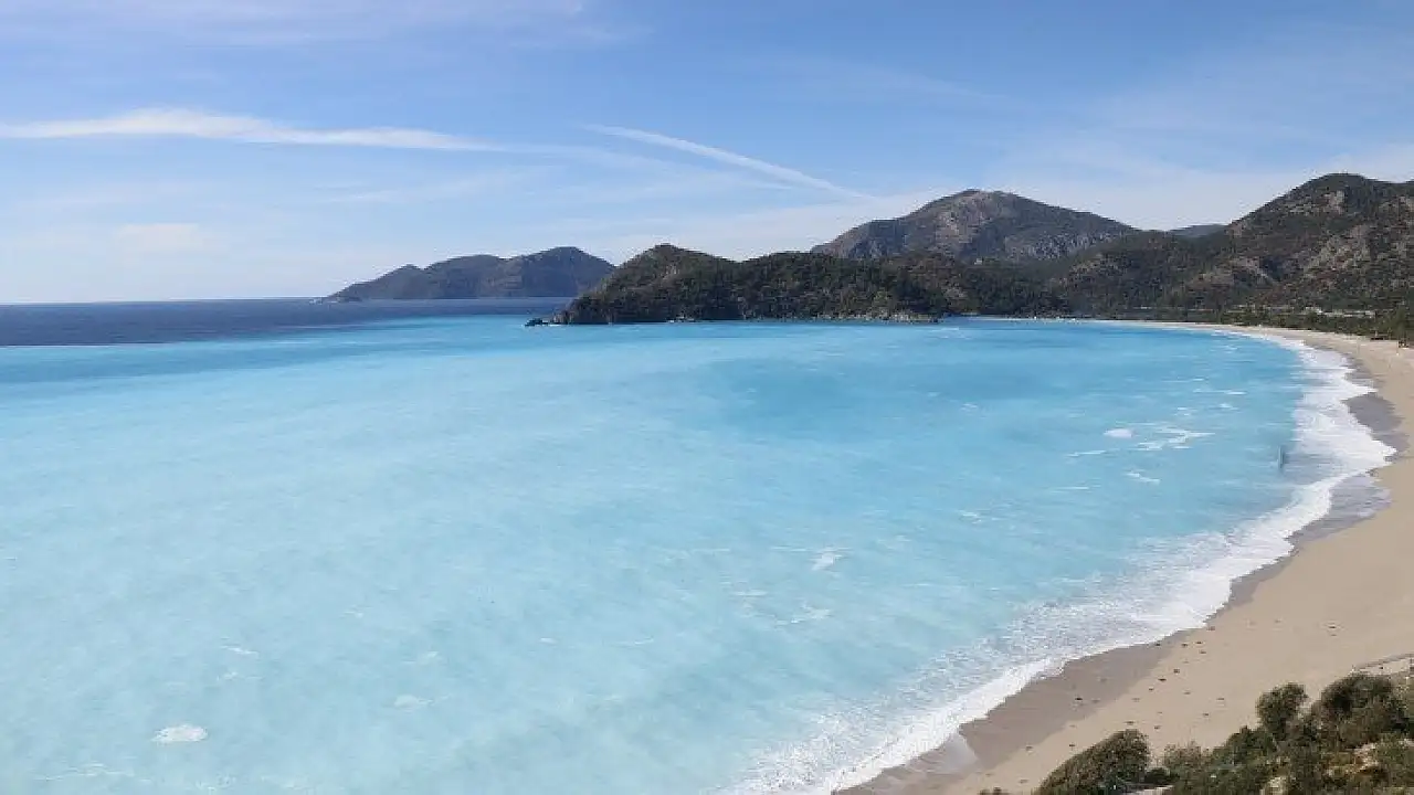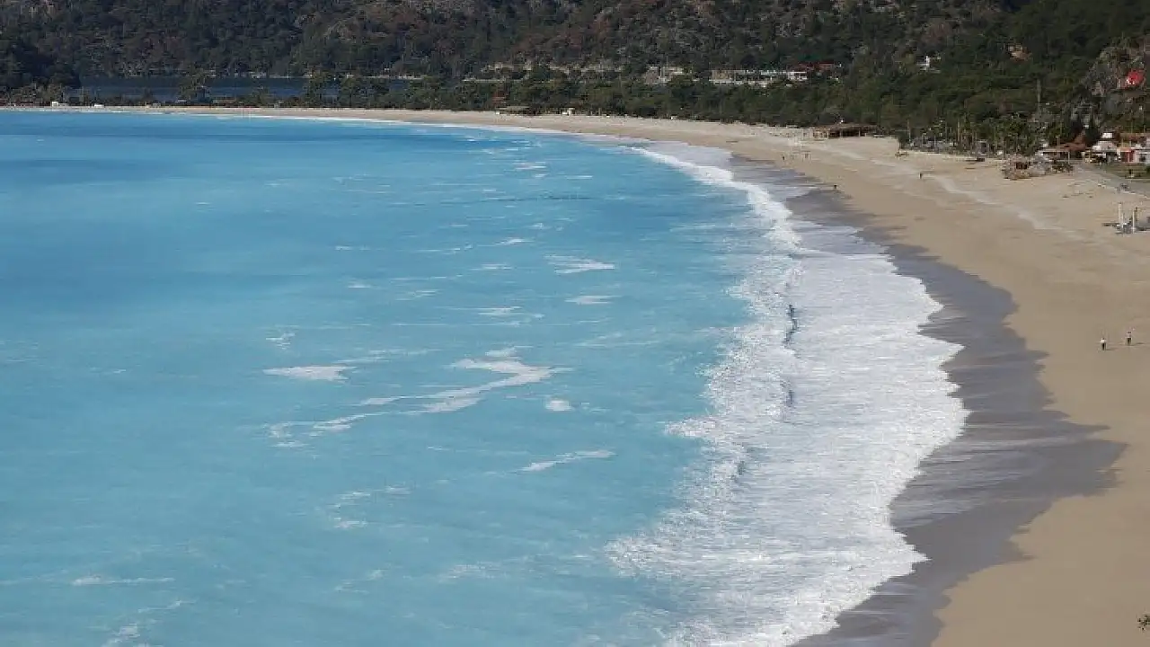 Muğla'nın Fethiye ilçesinde etkili olan fırtınalı ve yağışlı havanın ardından dünyaca ünlü Ölüdeniz Plajı'nda denizin rengi turkuaza dönüştü.