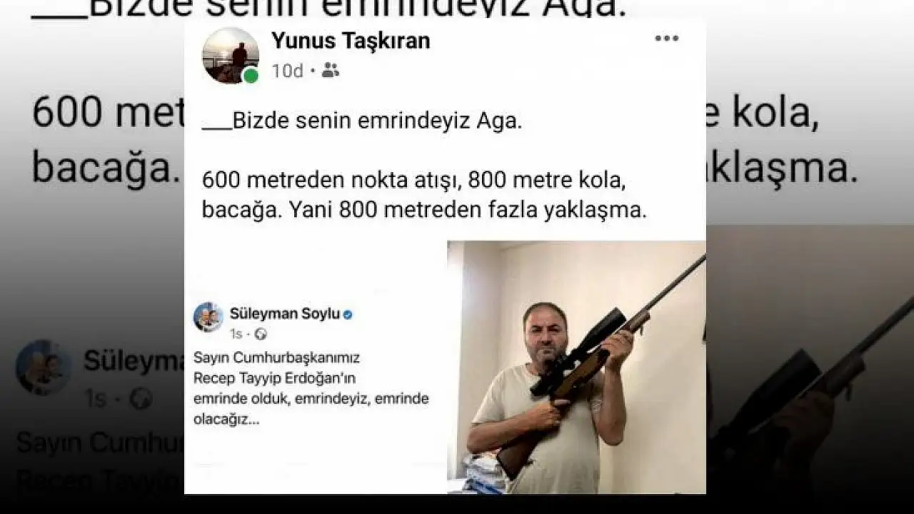 Fethiye'de din kültürü öğretmenliği yapan Yunus Taşkıran, silahlı fotoğrafıyla paylaştığı yazıda, "Biz de senin emrindeyiz Aga. 600 Metreden nokta atışı.800 metre kola, bacağa. Yani 800 metreden fazla yaklaşma" ifadeleri yer aldı.