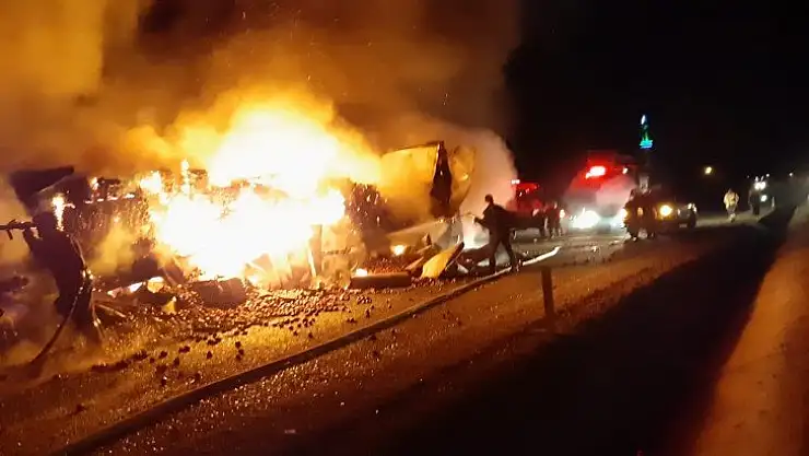 Muğla'nın Seydikemer İlçesinde domates yüklü yabancı plakalı tır bilinmeyen nedenle cayır cayır yandı.