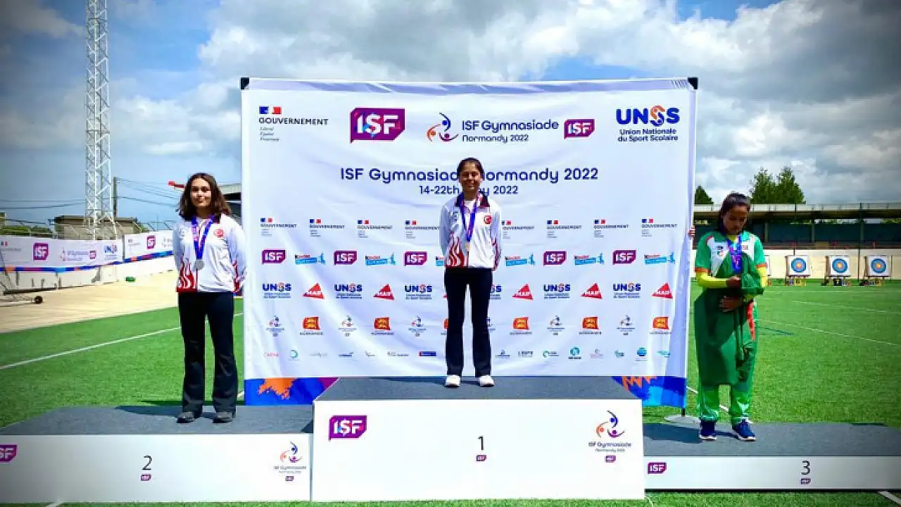 ISF 2022 Gymnasiade Liseler arası Okçuluk Dünya Şampiyonu Hazal Burun oldu.