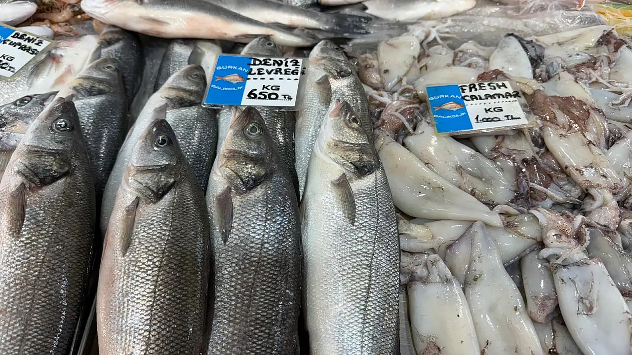 Fethiye Balık Pazarı’nda güncel fiyatlar şu şekilde: Deniz Levrek 600 TL, Çupra 500 TL, Kalamar 1000 TL, Karides 700 TL, Olta Çupra 1200 TL ve Sardalya 400 TL.