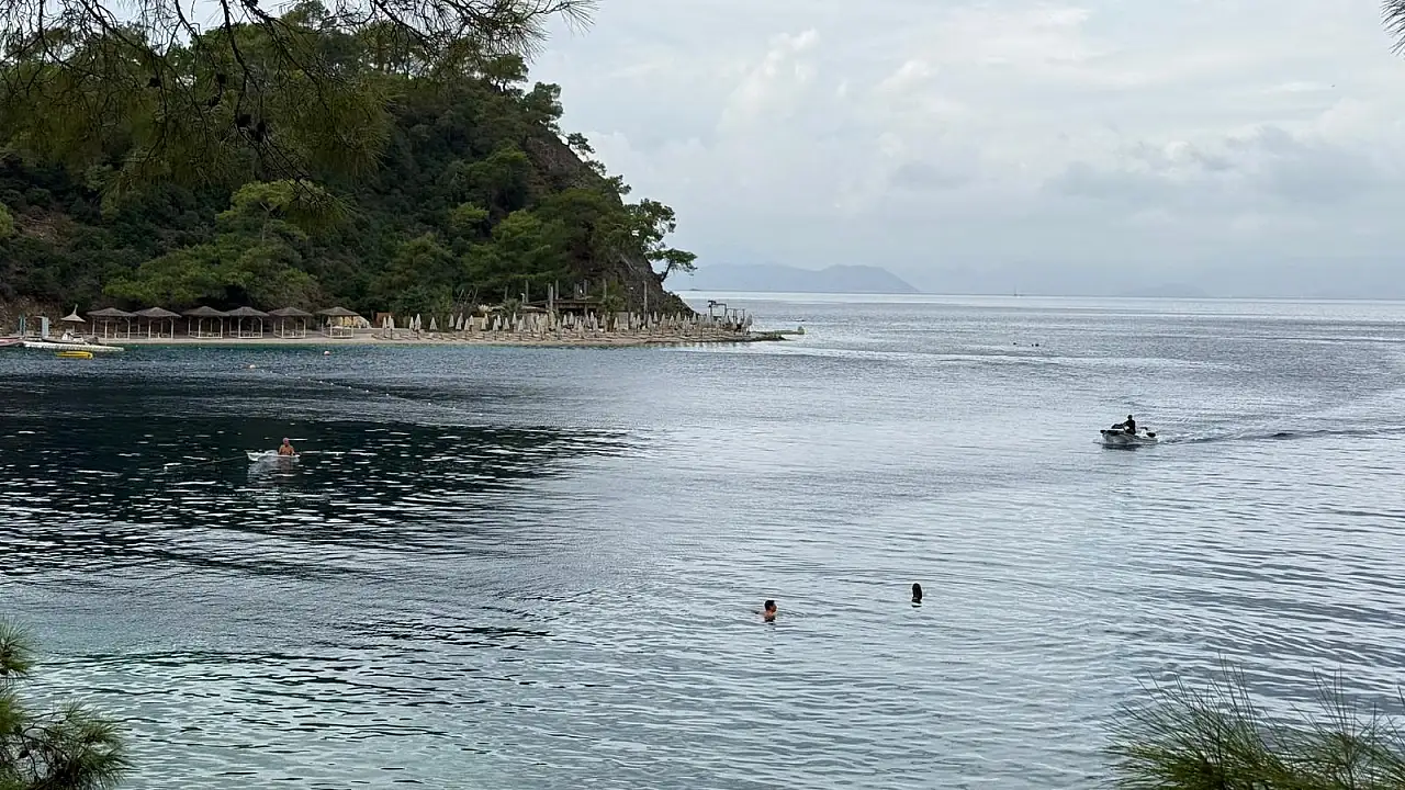Muğla'nın Fethiye ilçesinde Ekim ayının sonlarına gelinmesine rağmen soğuk deniz suyunu aldırmadan Yarımada'da denize giren tatilciler dikkat çekti.