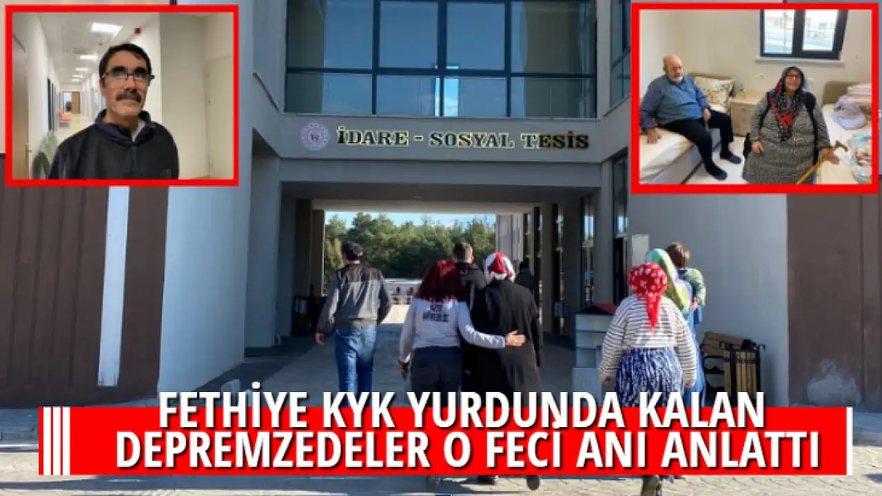 Fethiye KYK Yurdu'nda 5 yataklı 55 aile ve 45 bekâr odası olmak üzere yaklaşık 500 kişinin konaklaması için hazırlıklar tamamlandı. Burada depremzedelerin A'dan Z'ye tüm ihtiyaçları karşılanıyor. Osmaniye, Kahramanmaraş ve Hatay'dan olmak üzere yaklaşık 140 kişilik depremzede grubu Fethiye'deki KYK yurduna yerleştirildi. Deprem anına tanıklık edenler ise o anları anlattı.